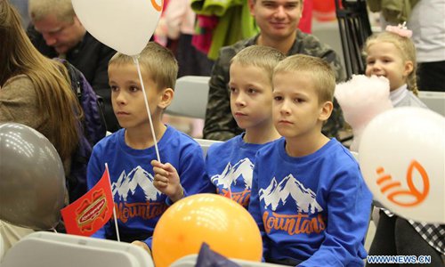 Triplet brothers take part in a festival of twins held in Minsk, Belarus, Oct. 12, 2019. A total of 150 families of twins and multiples took part in the event. (Xinhua)
