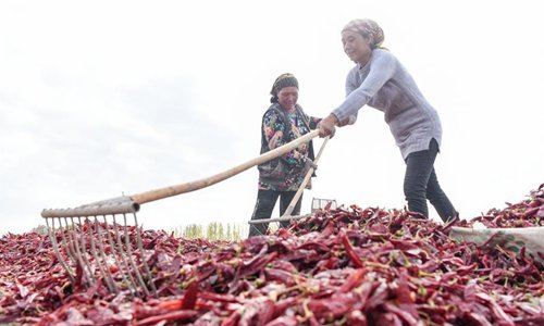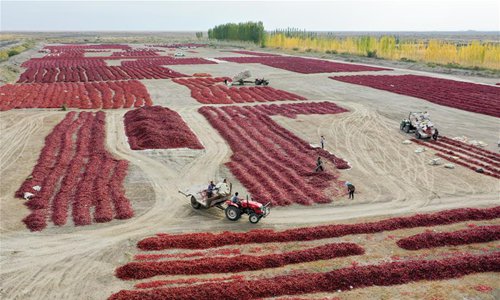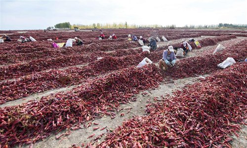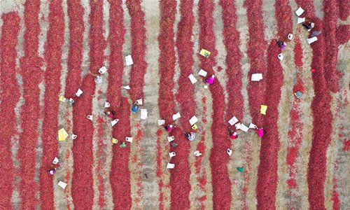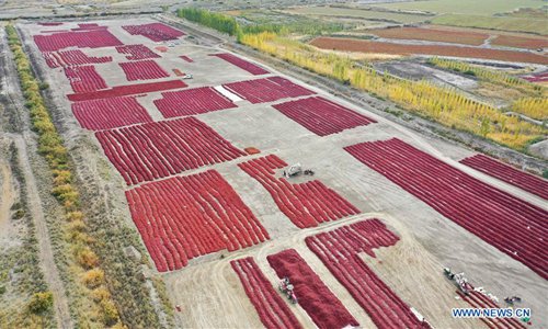 Farmers dry chili peppers in Bohu County, northwest China's Xinjiang Uygur Autonomous Region, Oct. 13, 2019. (Xinhua)