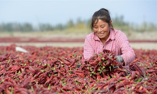 A farmer dries harvested chili peppers in Bohu County, northwest China's Xinjiang Uygur Autonomous Region, Oct. 13, 2019. (Xinhua)