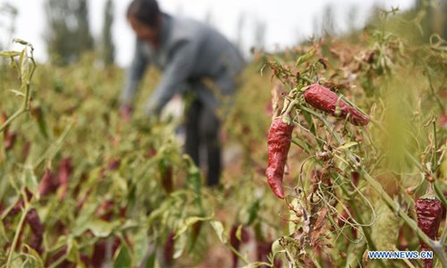 A farmer harvests chili peppers in Bohu County, northwest China's Xinjiang Uygur Autonomous Region, Oct. 13, 2019. (Xinhua)