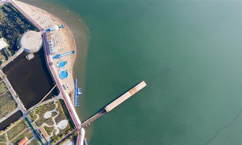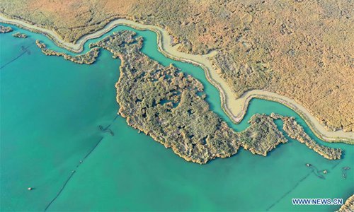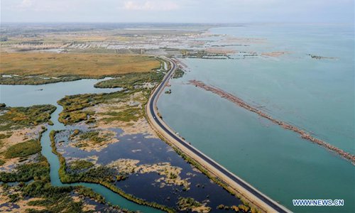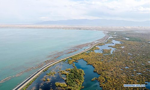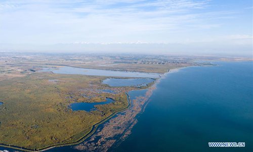 Aerial photo taken on Oct. 12, 2019 shows a view of the Bosten Lake in Bohu County, northwest China's Xinjiang Uygur Autonomous Region. (Xinhua)