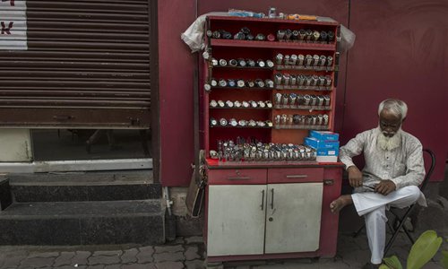 A watch seller waits for customers at a market place in Kolkata, India on Oct. 14, 2019. India's outlook for economic revival looks bleaker following the shrinking August factory production data along with lower inflation that reinforces fears of slowing economy and deteriorating consumer sentiment, according to analysts on Monday. (Xinhua/Tumpa Mondal)