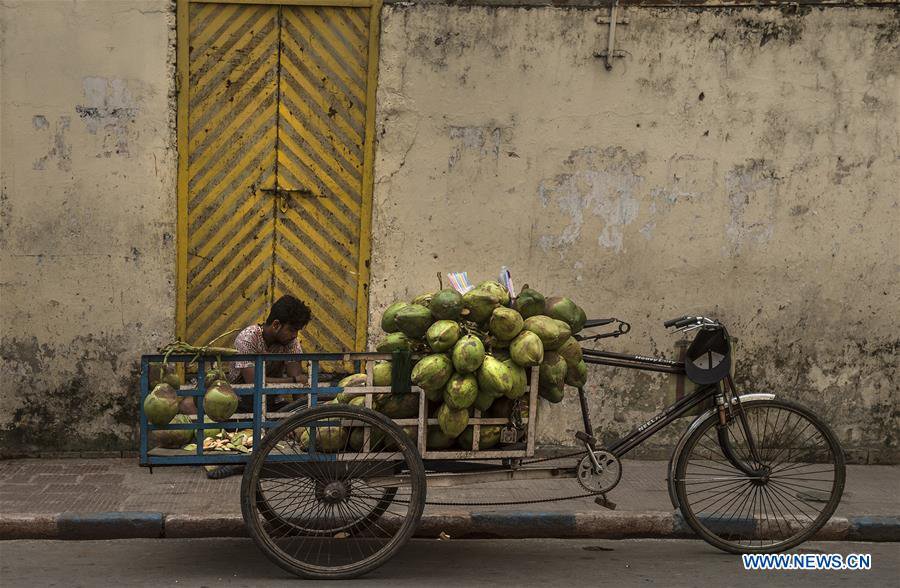 A green coconut seller waits for customers at a market place in Kolkata, India on Oct. 14, 2019. India's outlook for economic revival looks bleaker following the shrinking August factory production data along with lower inflation that reinforces fears of slowing economy and deteriorating consumer sentiment, according to analysts on Monday. (Xinhua/Tumpa Mondal)