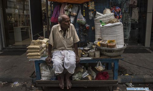 A vendor waits for customers at a market place in Kolkata, India on Oct. 14, 2019. India's outlook for economic revival looks bleaker following the shrinking August factory production data along with lower inflation that reinforces fears of slowing economy and deteriorating consumer sentiment, according to analysts on Monday. On Sunday, the World Bank had cut India's economic growth forecast to 6 percent compared to earlier forecast of 7.5 percent on lower demand. (Xinhua/Tumpa Mondal)
