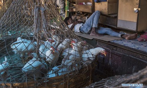 A chicken seller takes a nap while waiting for customers at a market place in Kolkata, India on Oct. 14, 2019. India's outlook for economic revival looks bleaker following the shrinking August factory production data along with lower inflation that reinforces fears of slowing economy and deteriorating consumer sentiment, according to analysts on Monday. (Xinhua/Tumpa Mondal)