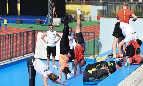 Military sports participants warm up at the athletes village for 7th International Military Sports Councils (CISM) Military World Games in Wuhan, Central China's Hubei Province on Friday. Photo: VCG