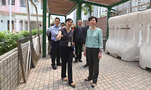Chief Executive of China's Hong Kong Special Administrative Region (HKSAR) Carrie Lam visits a transitional housing project of the Lok Sin Tong Benevolent Society Kowloon in Hong Kong, south China, Aug. 9, 2019. (Xinhua)