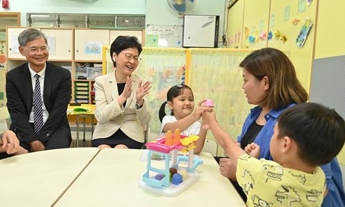 HKSAR Chief Executive Carrie Lam visits a nursery school providing pre-school rehabilitation services in Causeway Bay, Hong Kong, south China, Sept. 17, 2019. (Credit: www.news.gov.hk)