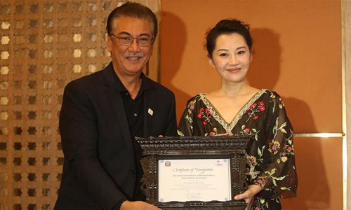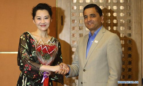 Chinese actress Xu Qing attends a ceremony conferring her as the tourism goodwill ambassador for the Visit Nepal Year (VNY) 2020 campaign in Kathmandu, Nepal, Oct. 19, 2019. Chinese actress Xu Qing was conferred the goodwill ambassador by Nepali Minister for Culture, Tourism and Civil Aviation Yogesh Bhattarai for the promotion of Nepal's tourism. (Xinhua/Sunil Sharma)