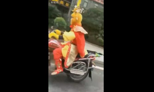 An actor who thought he'd save time getting to his next gig by riding his motorcycle while fully decked out in his Monkey King costume, attracted a lot of people's attention in Luzhou, Southwest China's Sichuan Province. Unfortunately, the man also caught the attention of local traffic police.