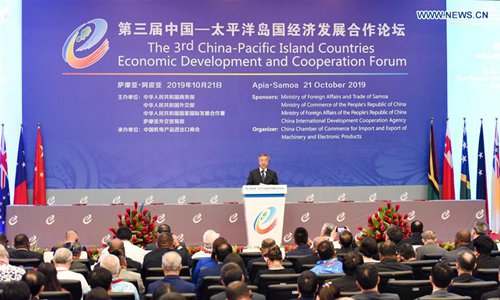 Chinese Vice Premier Hu Chunhua attends the opening ceremony and delivers a congratulatory message from Chinese President Xi Jinping at the 3rd China-Pacific Island Countries Economic Development and Cooperation Forum in Apia, Samoa, Oct. 21, 2019. (Xinhua/Guo Lei)