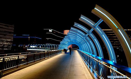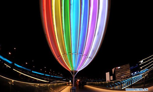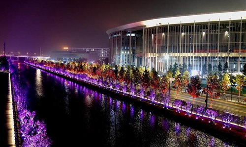 Colored lights illuminate the Xiaolaigang canal near the National Exhibition and Convention Center (Shanghai), the venue of the second China International Import Expo (CIIE), in east China's Shanghai, Oct. 25, 2019. The second CIIE is slated to take place here from Nov. 5 to 10. (Xinhua/Zhang Jiansong)