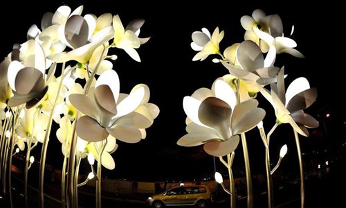 Photo taken on Oct. 25, 2019 shows orchid-shaped lights near the National Exhibition and Convention Center (Shanghai), the venue of the second China International Import Expo (CIIE), in east China's Shanghai. The second CIIE is slated to take place here from Nov. 5 to 10. (Xinhua/Zhang Jiansong)