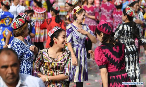 People dance at a square during a culture and tourism festival themed on Dolan and Qiuci culture in Awat County of Aksu Prefecture, northwest China's Xinjiang Uygur Autonomous region, Oct. 25, 2019. The festival kicked off recently in Aksu Prefecture. (Xinhua/Sadat)