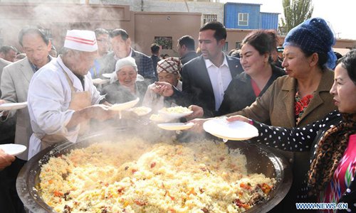 People taste pilaf during a culture and tourism festival themed on Dolan and Qiuci culture in Awat County of Aksu Prefecture, northwest China's Xinjiang Uygur Autonomous region, Oct. 25, 2019. The festival kicked off recently in Aksu Prefecture. (Xinhua/Sadat)