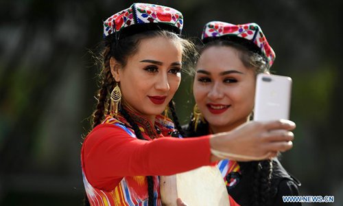 Actresses take a selfie during a culture and tourism festival themed on Dolan and Qiuci culture in Awat County of Aksu Prefecture, northwest China's Xinjiang Uygur Autonomous region, Oct. 25, 2019. The festival kicked off recently in Aksu Prefecture. (Xinhua/Sadat)