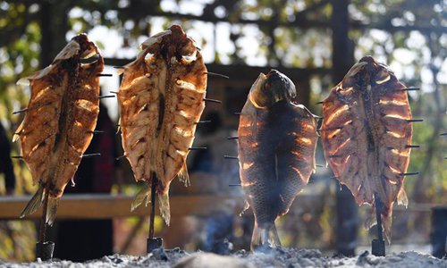 People roast fish at Dolan scenic spot of Awat County, northwest China's Xinjiang Uygur Autonomous Region, Oct. 26, 2019. (Xinhua/Sadat)