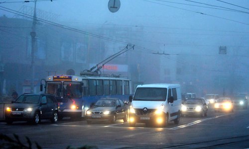 Motorists turn on their headlights during a foggy morning in Vinnytsia, central Ukraine on October 22, 2019. Photo: IC