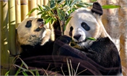 Panda cubs Jia Panpan and Jia Yueyue eat bamboo leaves in the Calgary Zoo, Canada, Oct. 30, 2019. Panda cubs Jia Panpan and Jia Yueyue in Canada's Calgary Zoo will be moving to the Giant Panda Research Base in Chengdu, capital of China's southwestern Sichuan Province, in early 2020, according to the Calgary Zoo. Jia Panpan, a male, and Jia Yueyue, a female, came to Calgary city in March 2018, and they are now almost 4 years old. The panda twins are leaving Calgary as the term of their loan agreement between Canada and China has come to an end. (Photo by Andrew Soong/Xinhua)