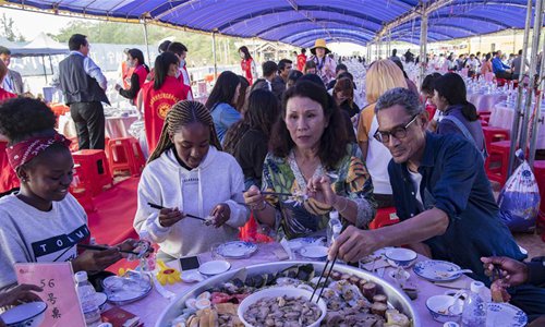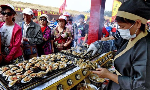 Tourists taste dishes made with oysters at an oyster gourmet festival held in Qinzhou City, south China's Guangxi Zhuang Autonomous Region, Nov. 2, 2019. An oyster gourmet festival was held in Qinzhou on Saturday. Qinzhou has developed an oyster industry which has a cultivation field of 150,000 mu (10,000 hectares) and an annual output of 265,000 tons. Photo: Xinhua