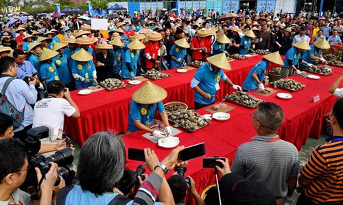 Participants take part in an oyster opening competition during an oyster gourmet festival held in Qinzhou City, south China's Guangxi Zhuang Autonomous Region, Nov. 2, 2019. An oyster gourmet festival was held in Qinzhou on Saturday. Qinzhou has developed an oyster industry which has a cultivation field of 150,000 mu (10,000 hectares) and an annual output of 265,000 tons. Photo: Xinhua