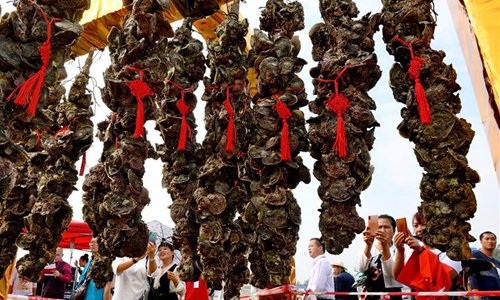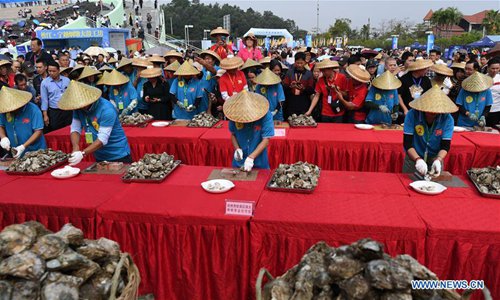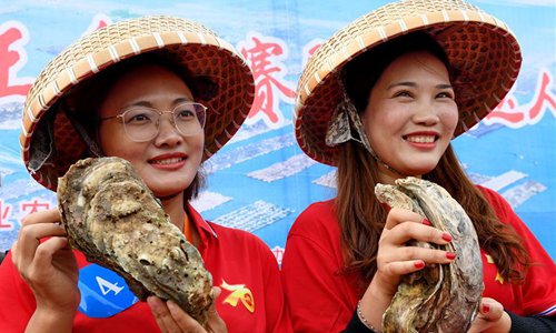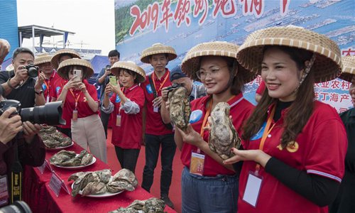 Farmers display oysters during an oyster gourmet festival held in Qinzhou City, south China's Guangxi Zhuang Autonomous Region, Nov. 2, 2019. An oyster gourmet festival was held in Qinzhou on Saturday. Qinzhou has developed an oyster industry which has a cultivation field of 150,000 mu (10,000 hectares) and an annual output of 265,000 tons. Photo: Xinhua