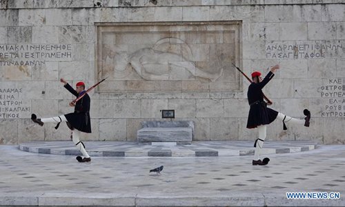 Guards perform the changing of the guard ceremony on Syntagma Square in Athens, Greece, Nov. 7, 2019. Photo:Xinhua