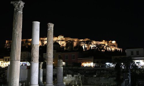 Photo taken on Oct. 28, 2019 shows a general night view of the Acropolis and the Temple of Olympian Zeus at the front in Athens, Greece. Photo:Xinhua
