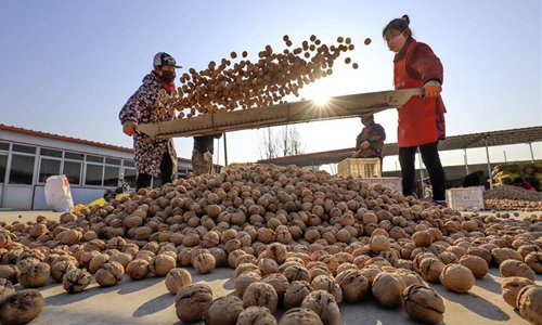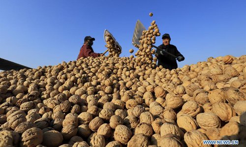 Farmers dry harvested walnuts in Jiuzhai Township of Zunhua, north China's Hebei Province, Nov. 10, 2019. (Xinhua/Mu Yu)