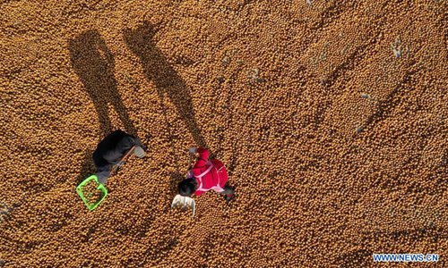Aerial photo taken on Nov. 10, 2019 shows farmers drying harvested walnuts in Jiuzhai Township of Zunhua, north China's Hebei Province. (Xinhua/Mu Yu)