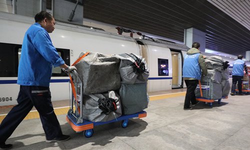 Logistic workers unload bundles of consumer goods at the Chengdu East Railway Station in Chengdu, capital of Southwest China's Sichuan Province on Monday. The city railway regulator rolled out a "arrive today" service that allowed delivery of goods the same day they were purchased during the Singles' Day shopping festival. Photo: VCG
