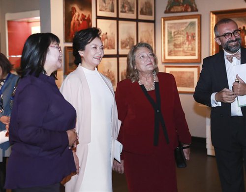 Peng Liyuan, wife of Chinese President Xi Jinping, toured the Benaki Museum in central Athens Monday, accompanied by Vlassia Pavlopoulou-Peltsemi, wife of Greek President Prokopis Pavlopoulos.