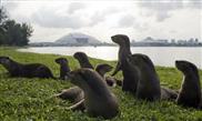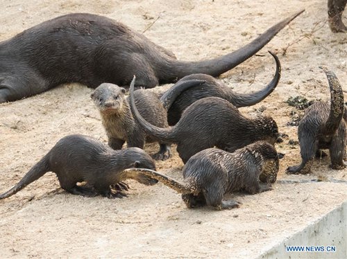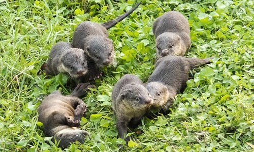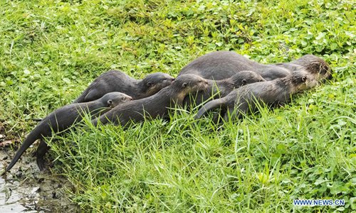Six young smooth-coated otter pups of Bishan family romp on the riverbank in Singapore's inland waters on Nov 12, 2019. Bishan family of smooth-coated otters are renown in the world, tracked by otter-watching enthusiasts since 2014, where the first sighting of a pair of male and female otters was recorded in Bishan Park (hence the name Bishan family). (Xinhua/Then Chih Wey)
