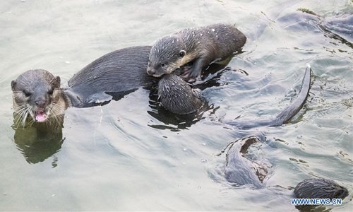 Young smooth-coated otter pups of Bishan family swim in the river in Singapore's inland waters on Nov 12, 2019. Bishan family of smooth-coated otters are renown in the world, tracked by otter-watching enthusiasts since 2014, where the first sighting of a pair of male and female otters was recorded in Bishan Park (hence the name Bishan family). (Xinhua/Then Chih Wey)