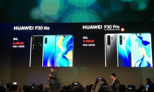 An event to launch new Huawei products in Sao Paulo, Brazil, April 30, 2019. Huawei launched its new P30 pro and P30 lite, two types of new Huawei products, at an event in Sao Paulo, Brazil. (Xinhua/Zhao Yan)