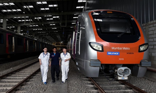 Chinese and Indian staff work at a metro car depot of Metro Line 1, in Mumbai, India, June 27, 2018. Mumbai Metro Line 1 became operational on June 8, 2014, with its trains produced by China's CRRC Nanjing Puzhen Co., Ltd. (Xinhua/Zhang Naijie)