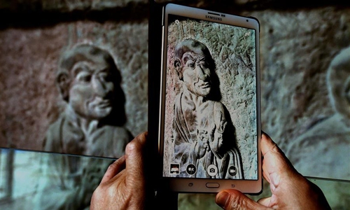 A tourist takes photo of the sculptures at Longmen Grottoes scenic area in Luoyang, central China's Henan Province, March 7, 2016. Photo:Xinhua