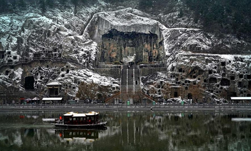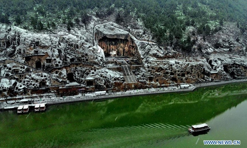 Photo taken on Jan. 9, 2019 shows the snow scenery at Longmen Grottoes scenic area in Luoyang, central China's Henan Province. Photo:Xinhua
