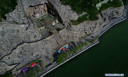 Aerial photo taken on April 18, 2017 shows the statues at Longmen Grottoes scenic area in Luoyang, central China's Henan Province. Photo:Xinhua