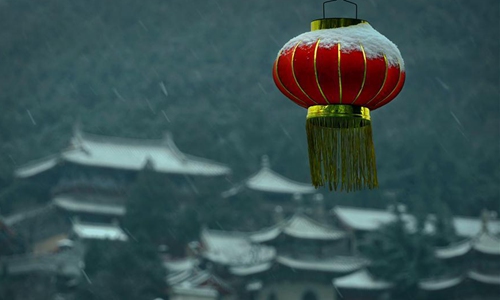 Photo taken on Jan. 9, 2019 shows the snow-covered Xiangshan temple at Longmen Grottoes scenic area in Luoyang, central China's Henan Province. Photo:Xinhua