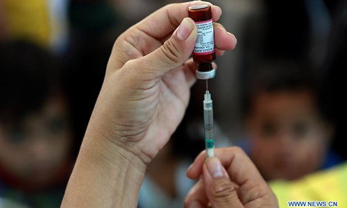 A medical worker prepares a free measles vaccine during the Philippine Red Cross Measles Outbreak Vaccination Response at a slum area in Manila, the Philippines, Feb. 16, 2019. The Philippine Department of Health (DOH) reported this week that over 4,300 measles cases were confirmed from Jan. 1 to Feb. 13, 2019, with the number expected to increase in the coming days. (Xinhua/Rouelle Umali)