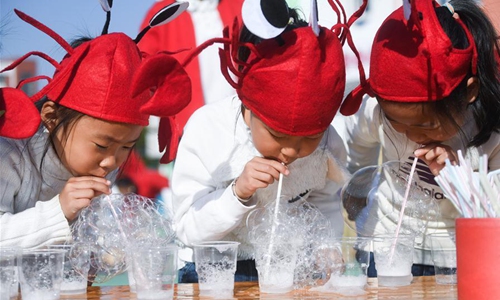 Children make bubbles during a crab festival for children in Hongqiao Town, Changxing County of east China's Zhejiang Province, Nov. 14, 2019. (Xinhua/Xu Yu)