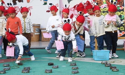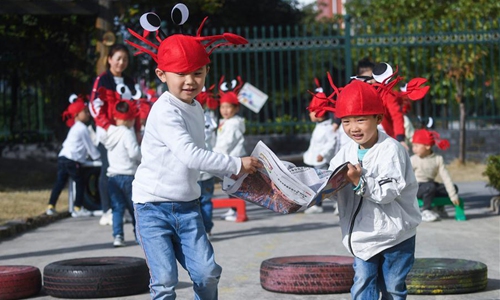 Children take part in a crab festival for children in Hongqiao Town, Changxing County of east China's Zhejiang Province, Nov. 14, 2019. (Xinhua/Xu Yu)
