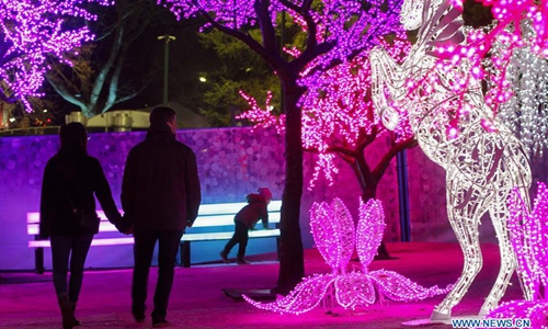 People walk past decorations during the Aurora Winter Festival in Vancouver, Canada. Nov. 21, 2019. Fifteen acres of open space are turned into a winter wonderland during the Aurora Winter Festival with light displays and holiday themed attractions.Photo:Xinhua