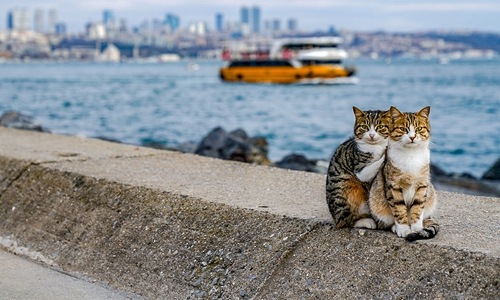 Two stray cats cuddle up together in Istanbul, Turkey. Photo: VCG