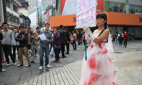A woman demonstrates against domestic violence in Shenzhen, South China's Guangdong Province, December 10, 2014. File Photo: VCG