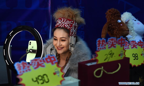 A live-broadcast consultant promotes agricultural products for a company at a fair in a gymnasium in Altay, northwest China's Xinjiang Uygur Autonomous Region, Nov. 27, 2019. The 14th Xinjiang Winter Tourism Trade Fair opened here on Wednesday. (Xinhua/Sadat)