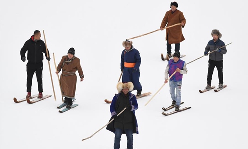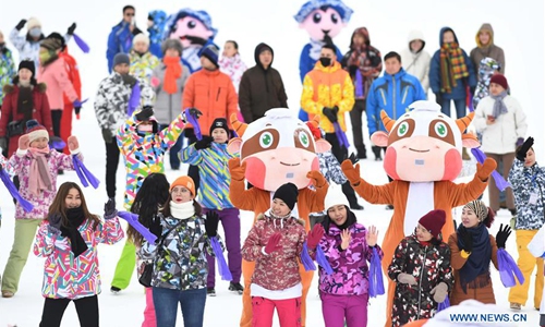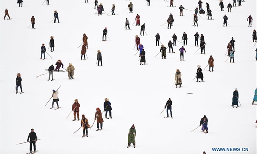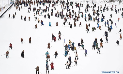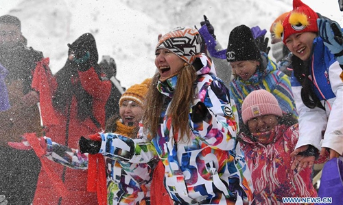 People take part in a carnival at a skiing field on Jiangjun Mountain in Altay, northwest China's Xinjiang Uygur Autonomous Region, Nov. 27, 2019. The 14th Xinjiang Winter Tourism Trade Fair opened here on Wednesday. (Xinhua/Sadat)