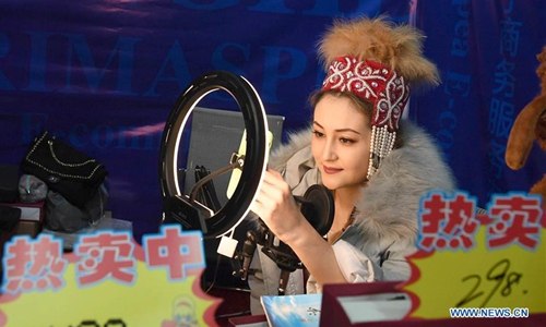 A live-broadcast consultant promotes agricultural products for a company at a fair held in a gymnasium in Altay, northwest China's Xinjiang Uygur Autonomous Region, Nov. 27, 2019. The 14th Xinjiang Winter Tourism Trade Fair opened here on Wednesday. (Xinhua/Sadat)