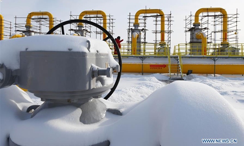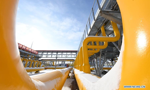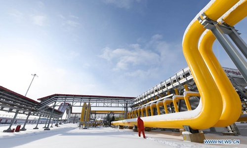 Photo taken on Nov. 19, 2019 shows the gas-distributing and compressing station of the China-Russia east-route natural gas pipeline in the city of Heihe, the first stop after the Russia-supplied natural gas enters China, northeast China's Heilongjiang Province. The China-Russia east-route natural gas pipeline was put into operation on Monday. The pipeline is scheduled to provide China with 5 billion cubic meters of Russian gas in 2020 and the amount is expected to increase to 38 billion cubic meters annually from 2024, under a 30-year contract worth 400 billion U.S. dollars signed between the China National Petroleum Corp (CNPC) and Russian gas giant Gazprom in May 2014. The cross-border gas pipeline has a 3,000-km section in Russia and a 5,111-km stretch in China. (Xinhua/Wang Jianwei)